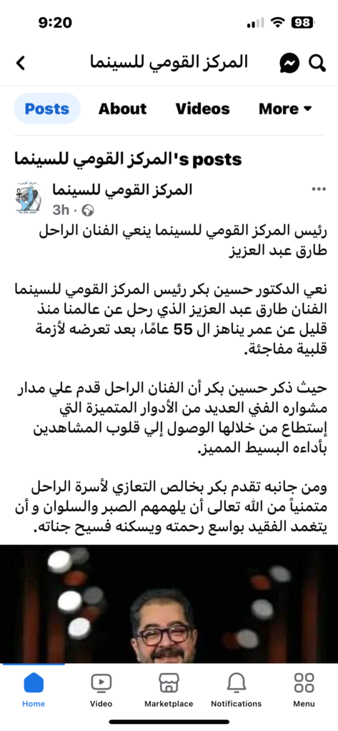 نعي الدكتور حسين بكر رئيس المركز القومي للسينما، الفنان طارق عبد العزيز، الذي رحل عن عالمنا مساء اليوم، عن عمر يناهز ال 55 عامًا، بعد تعرضه لأزمة قلبية مفاجئة.