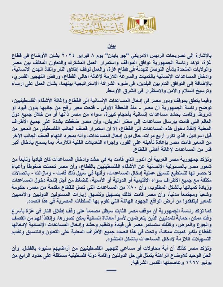 وشددت رئاسة الجمهورية، أن موقف مصر الثابت سيظل مصمماً على وقف إطلاق النار في غزة بأسرع وقت ممكن، حماية للمدنيين الذين يتعرضون لأسوأ معاناة إنسانية يمكن تصورها، وإنقاذاً لهم من القصف والجوع والمرض، وكذلك ستستمر مصر في قيادة وتنظيم وحشد وإدخال المساعدات الإنسانية لإدخالها للقطاع بأكبر كميات ممكنة.
