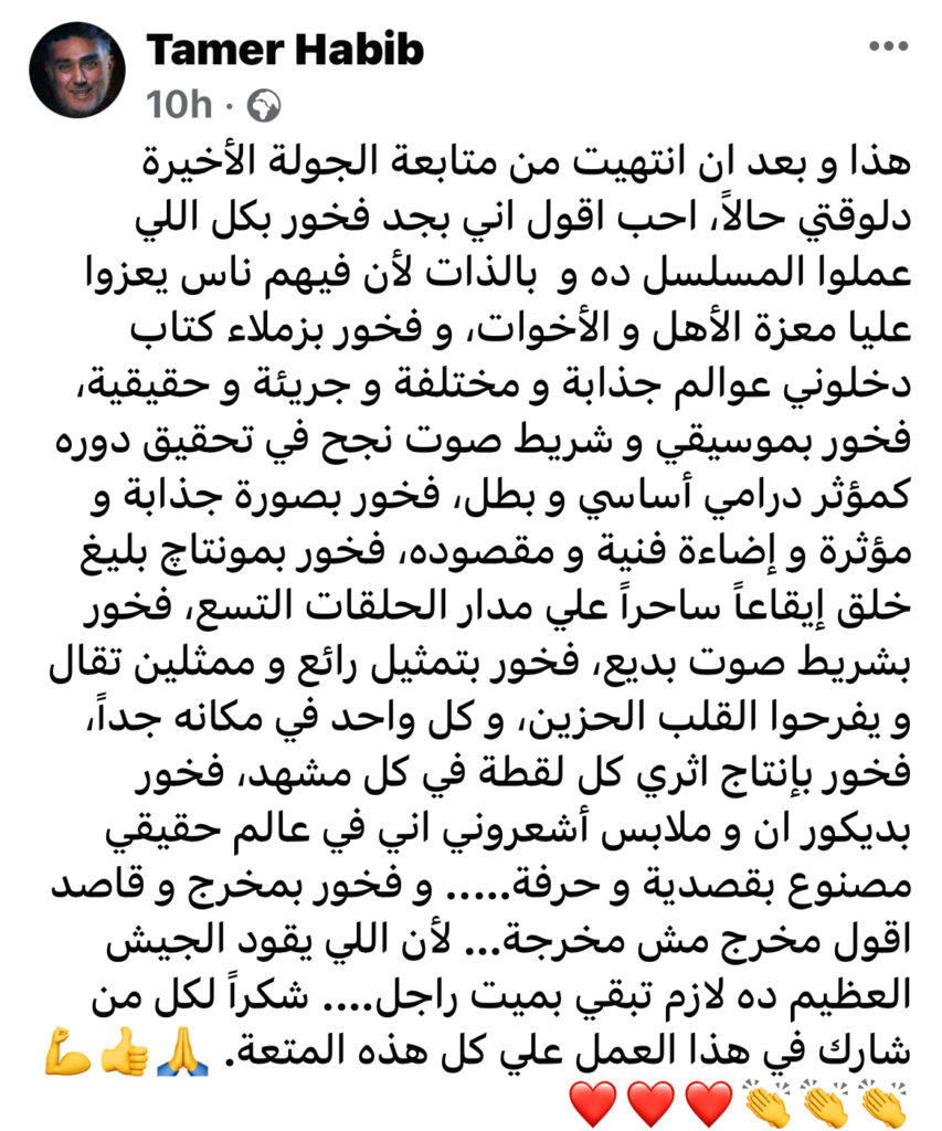 كتب تامر حبيب عبر حسابه الرسمي على الفيسبوك: “هذا وبعد أن انتهيت من متابعة الجولة الأخيرة دلوقتي حالًا، أحب أقول أني بجد فخور بكل اللي عملوا المسلسل ده وبالذات لأن فيهم ناس يعزوا عليا معزة الأهل والأخوات”.