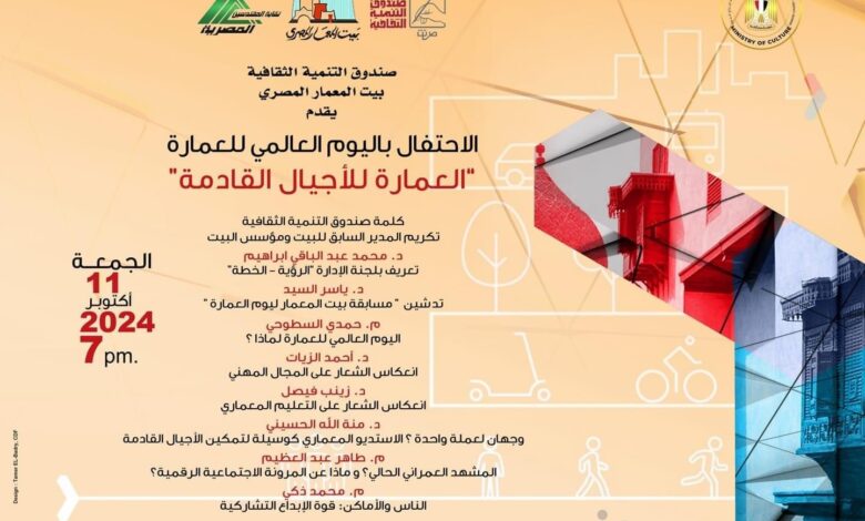 ينظم بيت المعمار المصري بدرب اللبانة بالقلعة، التابع لقطاع صندوق التنمية الثقافية برئاسة المعماري حمدي السطوحي، إحتفالية كبرى بمناسبة يوم العمارة العالمي والمعلن من قبل الاتحاد الدولي للمعماريين، تحت عنوان (تمكين الأجيال القادمة)، وذلك في السابعة مساء الجمعة القادم (11 أكتوبر).
