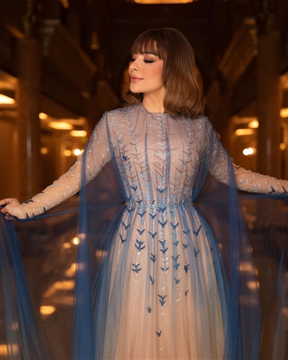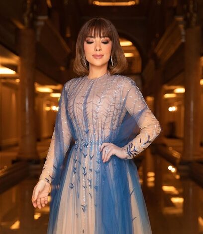 ظهرت النجمة أصالة في حفلها بإمارة أبو ظبي مؤخرًا بإطلالة أنيقة، حيث ظهرت بفستان ذو أكمام يجمع درجات الأزرق الفاتح بتدريجات فريدة ومميزة.