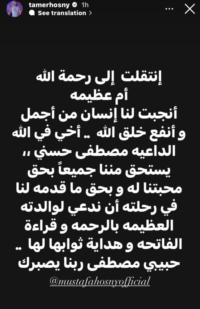 في سياق آخر، حرص الفنان تامر حسني أن يقدم واجب العزاء، حيث نشر عبر خاصية الإستوري على حسابه الرسمي على الإنستجرام :”انتقلت إلى رحمة الله أم عظيمة أنجبت لنا إنسان من أجمل وأنفع خلق الله، أخي في الله الداعية مصطفى حسني”.