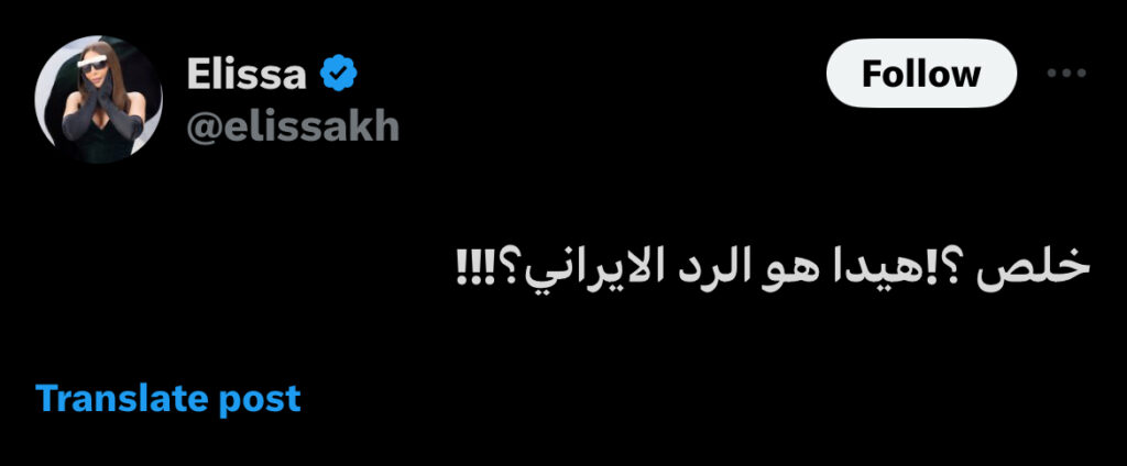 كتبت إليسا معلقة: “خلص ؟!هيدا هو الرد الايراني؟!!!”.