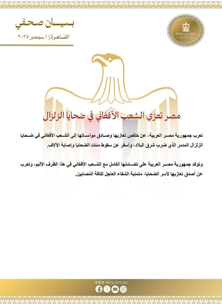 أعربت جمهورية مصر العربية، عن خالص تعازيها وصادق مواساتها إلى الشعب الأفغاني في ضحايا الزلزال المدمر الذي ضرب شرق البلاد، وأسفر عن سقوط مئات الضحايا وإصابة الآلاف.