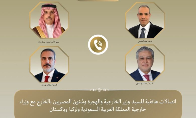 أجرى الدكتور بدر عبد العاطي، وزير الخارجية والهجرة وشؤون المصريين بالخارج، اتصالات هاتفية، مع كل من الأمير فيصل بن فرحان وزير خارجية المملكة العربية السعودية، وهاكان فيدان نظيره التركي، ومحمد إسحاق دار نائب رئيس الوزراء ووزير خارجية باكستان، وذلك في إطار التنسيق المشترك قبيل انعقاد القمة العربية الإسلامية الطارئة بالدوحة.
