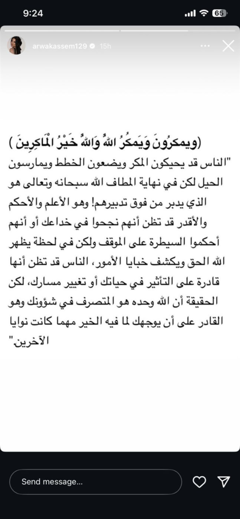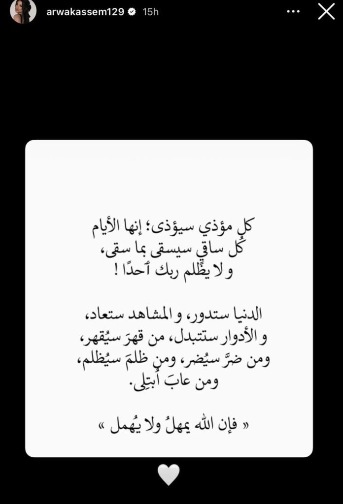 نشرت أروى قاسم “استوري” عبر حسابها قالت فيها: «كل مؤذٍ سيؤذى.. الدنيا ستدور والمشاهد ستعاد والأدوار ستتبدل، فإن الله يمهل ولا يهمل».