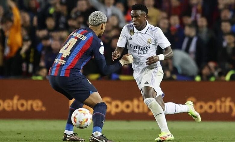 وقام فينيسيوس بإمساك بمنشفة وبدأ يلوّح بها احتفالًا بالفوز أمام مقاعد بدلاء برشلونة، ما زاد من حدة الأجواء. كما أشار كارفاخال نحو لامين يامال قائلاً: “تحدث الآن…”