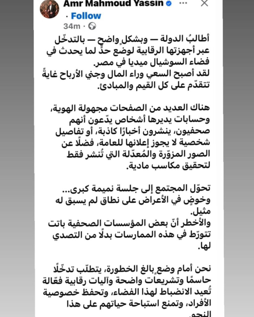 أطلق الفنان والمؤلف عمرو محمود ياسين تحذيرًا شديد اللهجة عبر حسابه الرسمي على «فيسبوك»، مطالبًا الدولة بالتدخل الفوري لوضع حد لما وصفه بـ«فوضى السوشيال ميديا» في مصر.