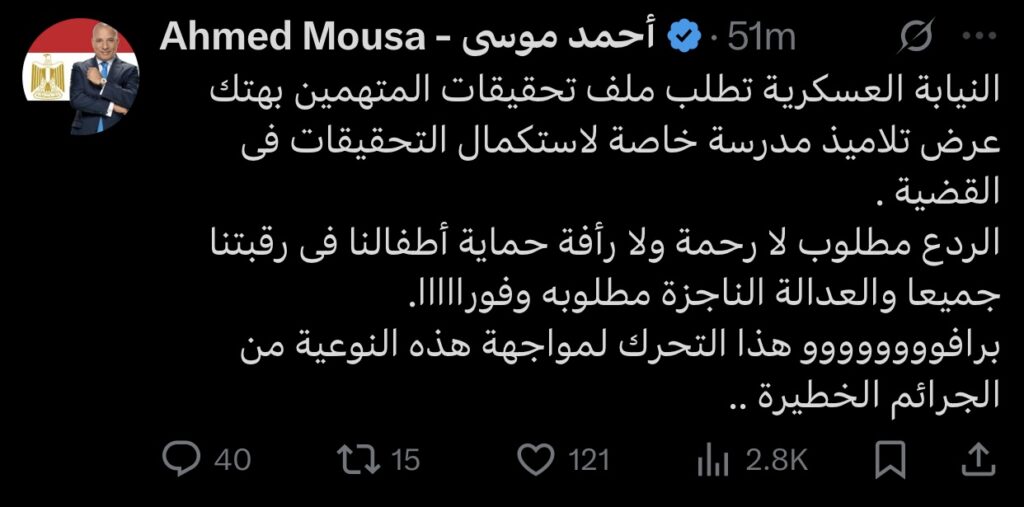 كتب موسى عبر حسابه الرسمي على منصة إكس: “الردع مطلوب، حماية أطفالنا في رقبتنا جميعًا، والعدالة الناجزة مطلوبة فورًا برافو هذا التحرك لمواجهة هذه النوعية من الجرائم الخطيرة.”