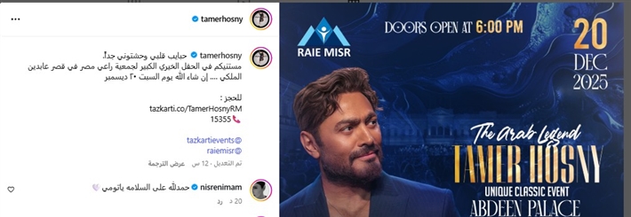 وفي سياق آخر، أعلن تامر حسني عودته القريبة لجمهوره، حيث يستعد لإحياء أول حفل له بعد الأزمة الصحية. ونشر عبر حسابه على إنستجرام بوستر الحفل الخيري لجمعية راعي مصر، والمقرر إقامته في قصر عابدين الملكي يوم السبت 20 ديسمبر، قائلا: “حبايبي قلبي وحشتوني جداً… مستنيكم في الحفل الكبير قريباً”.