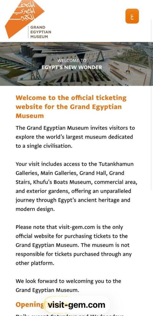 أعلنت وزارة السياحة والآثار، عن إغلاق موقع إلكتروني مزوّر كان يبيع تذاكر زيارة المتحف المصري الكبير، مؤكدة أن الموقع الرسمي والوحيد المعتمد للحجز هو visit-gem.com.