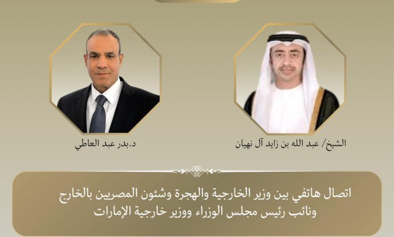 جرى اتصال هاتفي، بين الدكتور بدر عبد العاطي، وزير الخارجية والهجرة وشئون المصريين بالخارج، وعبد الله بن زايد آل نهيان، نائب رئيس مجلس الوزراء وزير الخارجية بدولة الإمارات العربية المتحدة، في إطار التشاور والتنسيق المستمر بين البلدين الشقيقين.