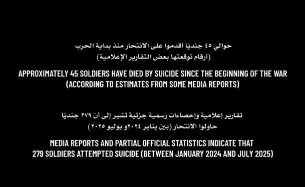 أشارت البيانات المعروضة إلى تسجيل ما لا يقل عن 279 محاولة انتحار بين جنود الاحتلال، خلال الفترة من يناير 2024 وحتى يوليو 2025، وفق تقديرات وتقارير إعلامية، ما يعكس تصاعد الأزمة النفسية داخل صفوف الجيش.