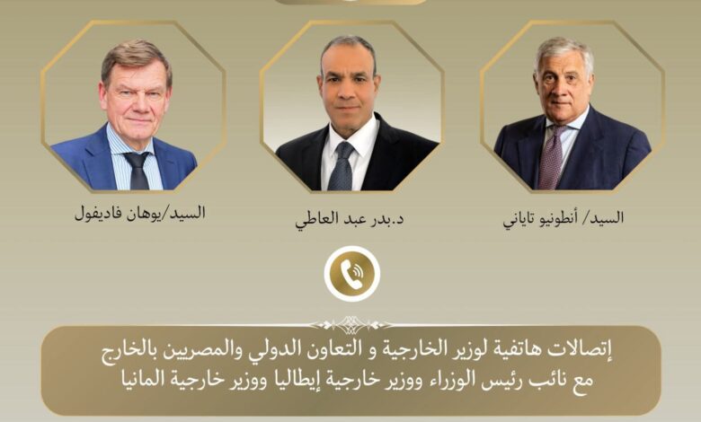 أجرى الدكتور بدر عبد العاطي، وزير الخارجية والتعاون الدولي والمصريين بالخارج، اتصالين هاتفيين مع كل من أنطونيو تاياني، نائب رئيس الوزراء ووزير خارجية إيطاليا، ويوهان فاديفول، وزير خارجية ألمانيا، وذلك لبحث مستجدات الأوضاع الإقليمية وجهود خفض التصعيد، في أعقاب إعلان الولايات المتحدة وإيران وقف إطلاق النار واستعداد الجانبين لعقد مفاوضات مرتقبة في إسلام آباد.