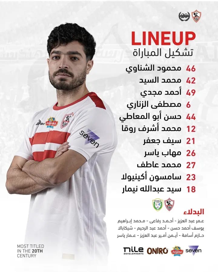 ويتواجد على مقاعد البدلاء، عمر عبد العزيز وأحمد رفاعي ومحمد إبراهيم ويوسف أحمد حسن وأحمد عبد الرحيم “إيشو” وعمار ياسر وحازم أسامة ومحمود عبد الرازق”شيكابالا” وأيمن أمير عبد العزيز.