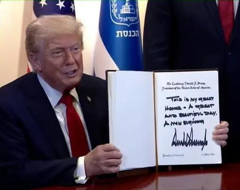 ترامب يوقع في سجل زوار الكنيست الإسرائيلي ويؤكد انتهاء الحرب في غزة