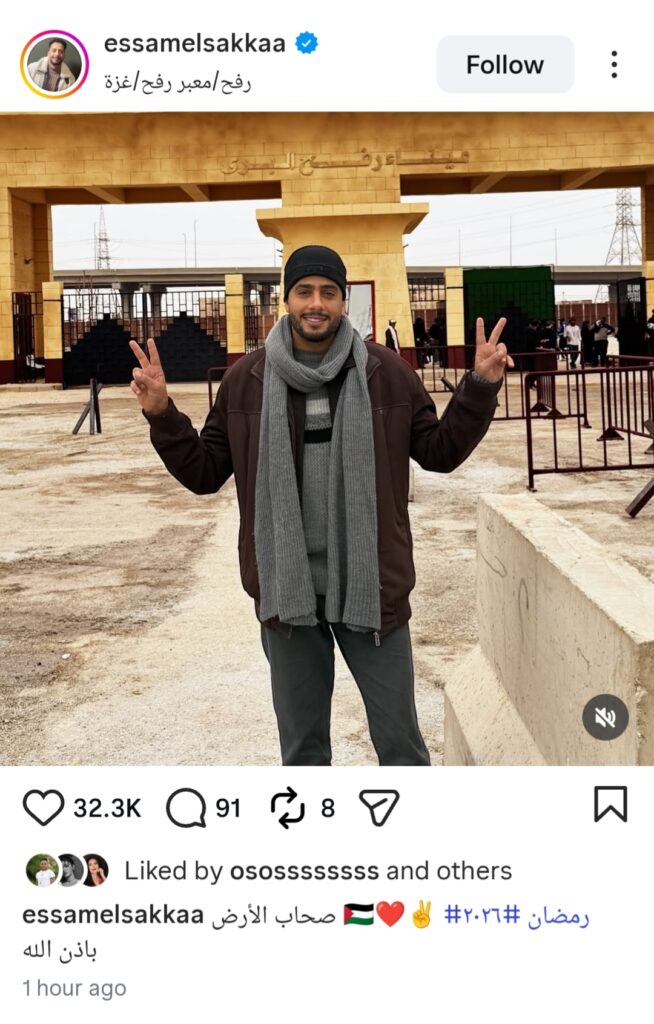 نشر عصام السقا صورة من أمام معبر رفح وعلق كاتبًا: «صحاب الأرض بأذن الله رمضان 2026»، وهو التعليق الذي لاقى تفاعلًا واسعًا من متابعيه ومتابعي أخبار الدراما العربية عبر مواقع التواصل الاجتماعي.