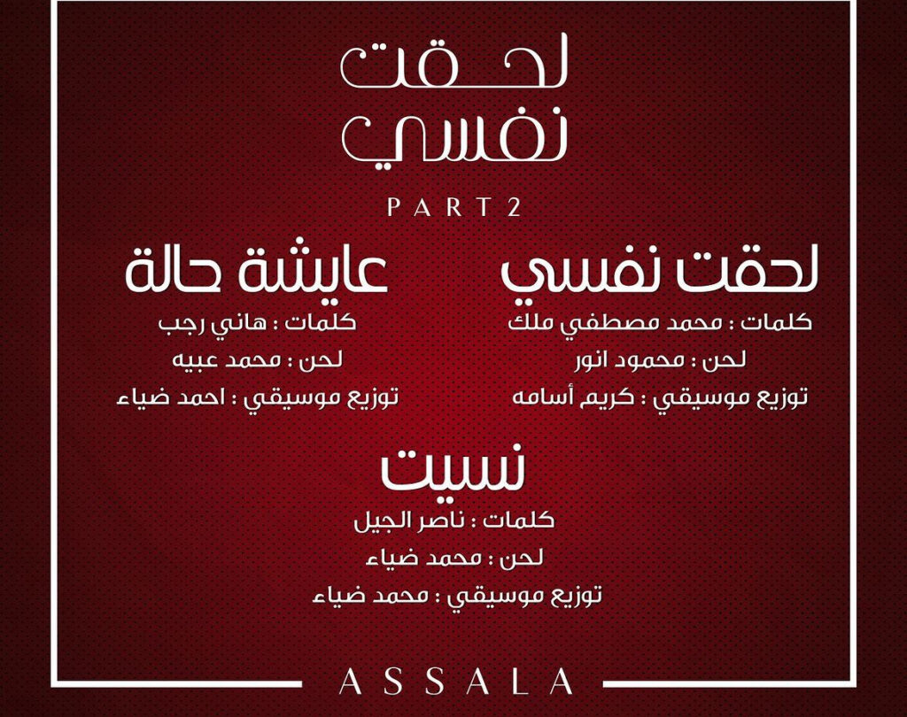 من ضمن هذه الأغنيات، أغنية لحقت نفسي، وهي من كلمات محمد مصطفى ملك، ولحن محمود أنور، وتوزيع موسيقي كريم أسامة، وأغنية عايشة حالة، من كلمات هاني رجب، ولحن محمد عبيه، وتوزيع موسيقي أحمد ضياء.