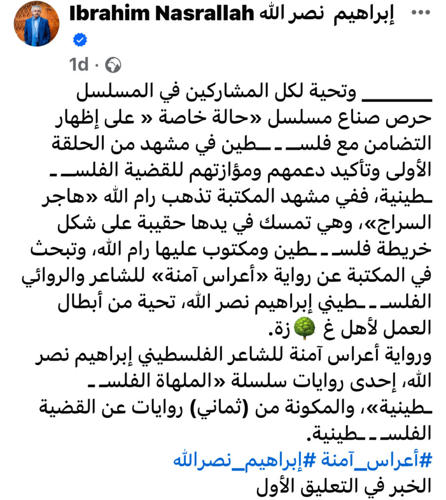 كتب نصر الله عبر صفحته الرسمية على الفيسبوك: “حرص صناع مسلسل حالة خاصة على التضامن مع فلسـطين، ففى مشهد تذهب “هاجر السراج”، وهى تمسك فى يدها حقيبة على شكل خريطة فلسـطين ومكتوب عليها رام الله، وتبحث فى المكتبة عن رواية “أعراس آمنة” للشاعر والروائى الفلسطينى إبراهيم نصر الله، تحية لأهل غزة، وهو من الروايات فى سلسلة الملهاة الفلسطينية والمكونة من ثمانى روايات عن القضية الفلسطينية”.