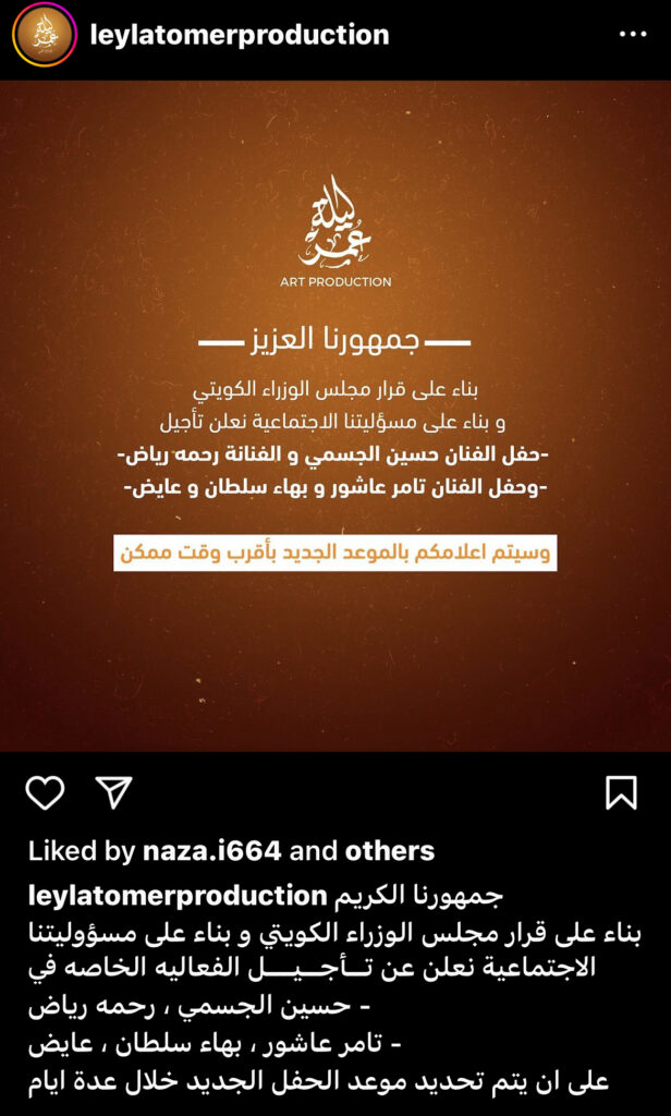 وجاء بيان الشركة المنظمة كالتالي: جمهورنا الكريم بناءً على قرار مجلس الوزراء الكويتي، وبناءً على مسؤوليتنا الاجتماعية، نُعلن عن تأجيل الفعالية الخاصة بـ حسين الجسمي، ورحمة رياض، وتامر عاشور، وبهاء سلطان، على أن يتم تحديد موعد الحفل الجديد خلال عدة أيام.