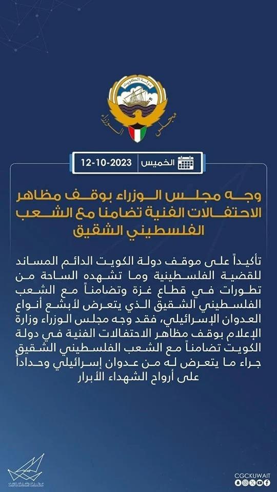 ووجه مجلس الوزراء الكويتي، وزارة الإعلام، بإلغاء كافة مظاهر الاحتفالات الفنية، وذلك تضامنا مع الشعب الفلسطيني بعد العدوان الإسرائيلي، وحدادا على أرواح شهداء فلسطين.